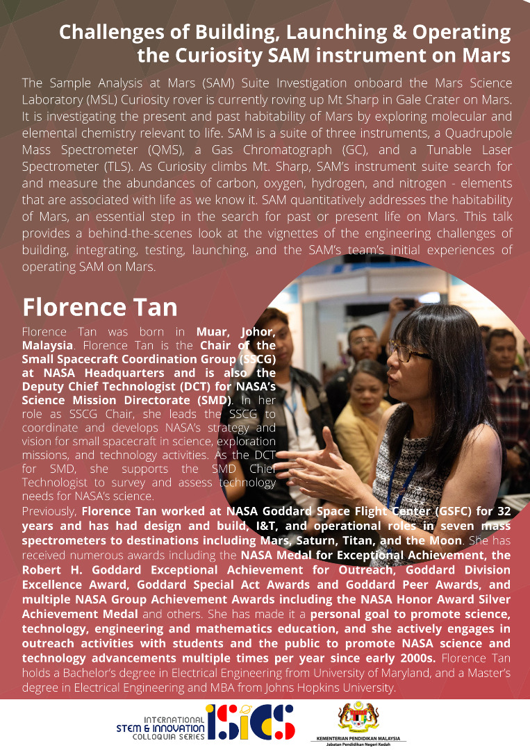 Florence Tan was born in Muar, Johor, Malaysia. She is the Chair of the Small Spacecraft Coordination Group (SSCG) at NASA Headquarters and the Deputy Chief Technologist (DCT) for NASA’s Science Mission Directorate (SMD). In her role as SSCG Chair, Florence leads the SSCG to coordinate and develop NASA’s strategy and vision for small spacecraft in science, exploration missions, and technology activities and provides advice to the Associate Administrators of the Space Technology Mission Directorate (STMD), Human Exploration and Operations Mission Directorate (HEOMD) and SMD. As the DCT for SMD, she supports the SMD Chief Technologist survey and assesses technology needs for NASA’s science.