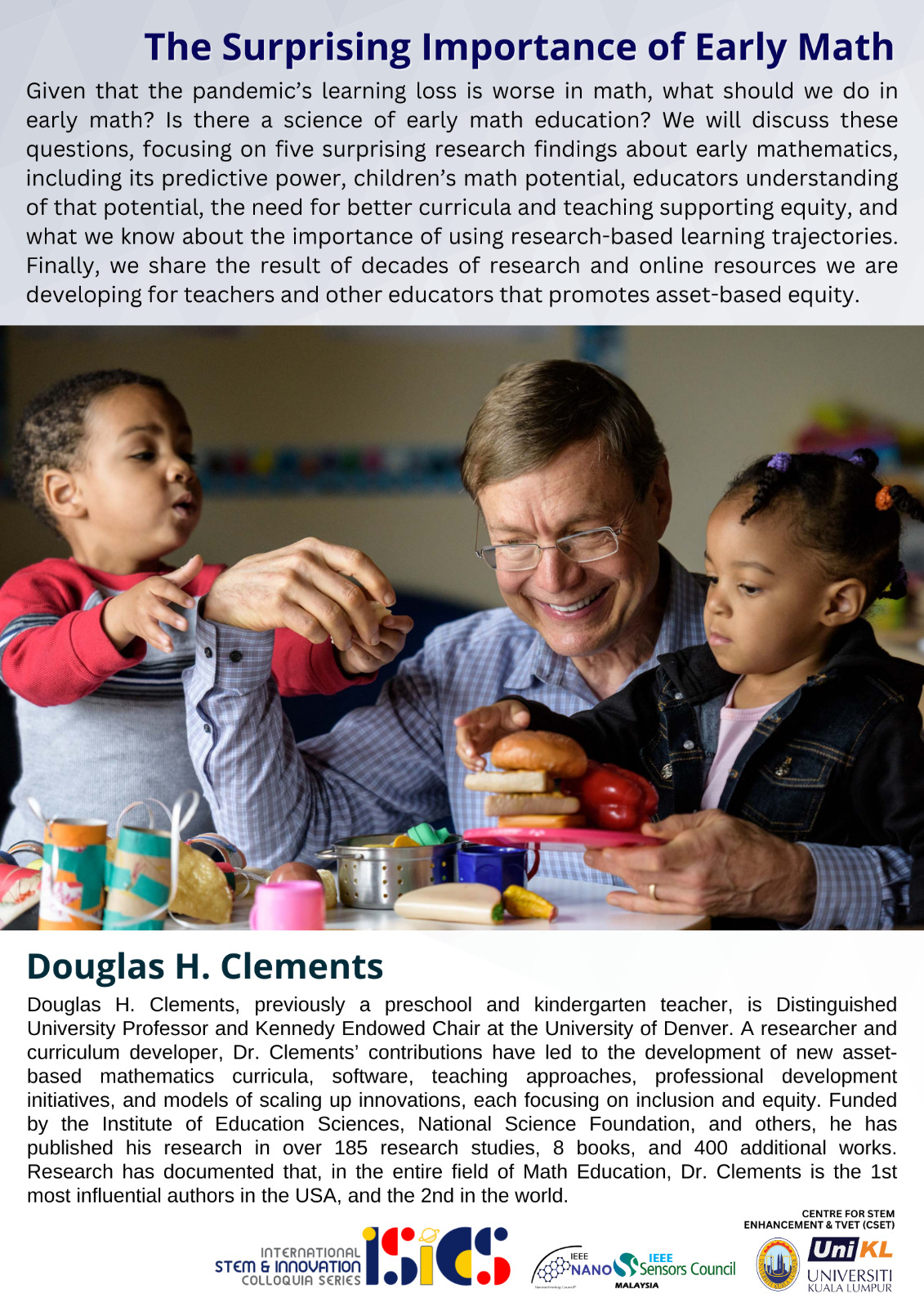 Douglas H. Clements, previously a preschool and kindergarten teacher, is Distinguished University Professor and Kennedy Endowed Chair at the University of Denver. A researcher and curriculum developer, Dr. Clements' contributions have led to the development of new asset-based mathematics curricula, software, teaching approaches, professional development initiatives, and models of scaling up iinovations, each focusing on inclusion and equity. Funded by the Institute of Education Sciences, National Science Foundation, and others, he haspublished his research in over 185 research studies, 8 books, and 400 additional works. Research has documented that, in the entire field of Math Education, Dr. Clements is the 1st most influential authors in the USA, and the 2nd in the world.